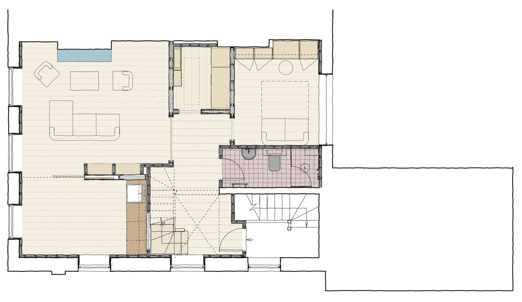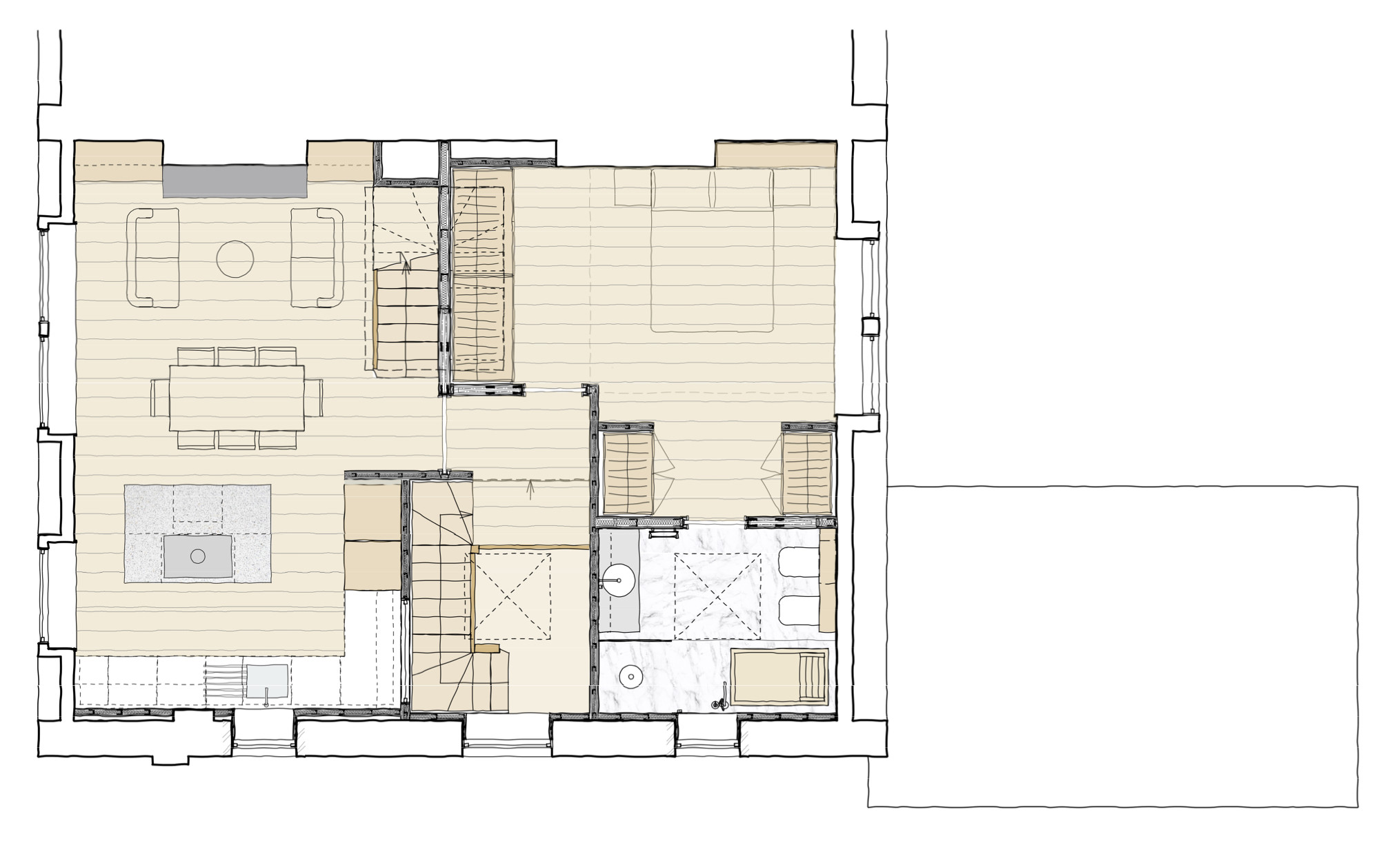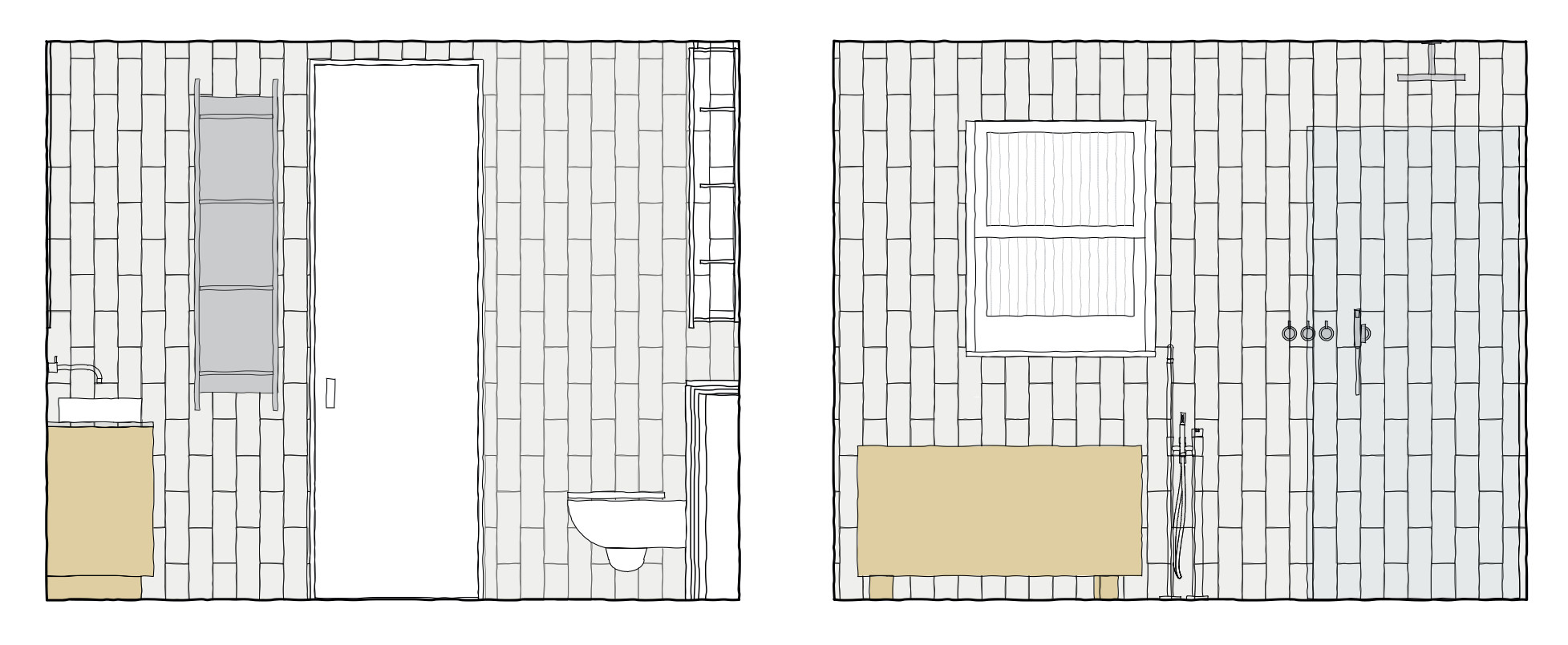 An example of the close collaboration to interpret and implement our clients design thinking are the ensuite bathroom and shower room spaces which are dramatically different to each other.