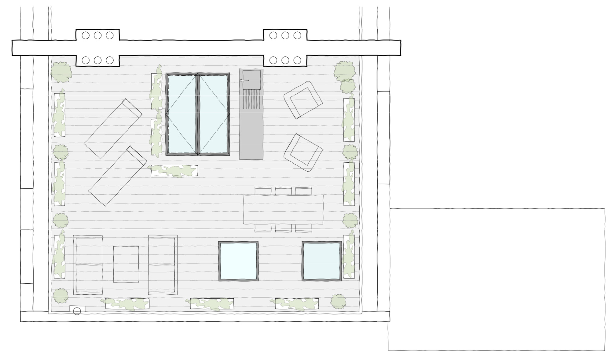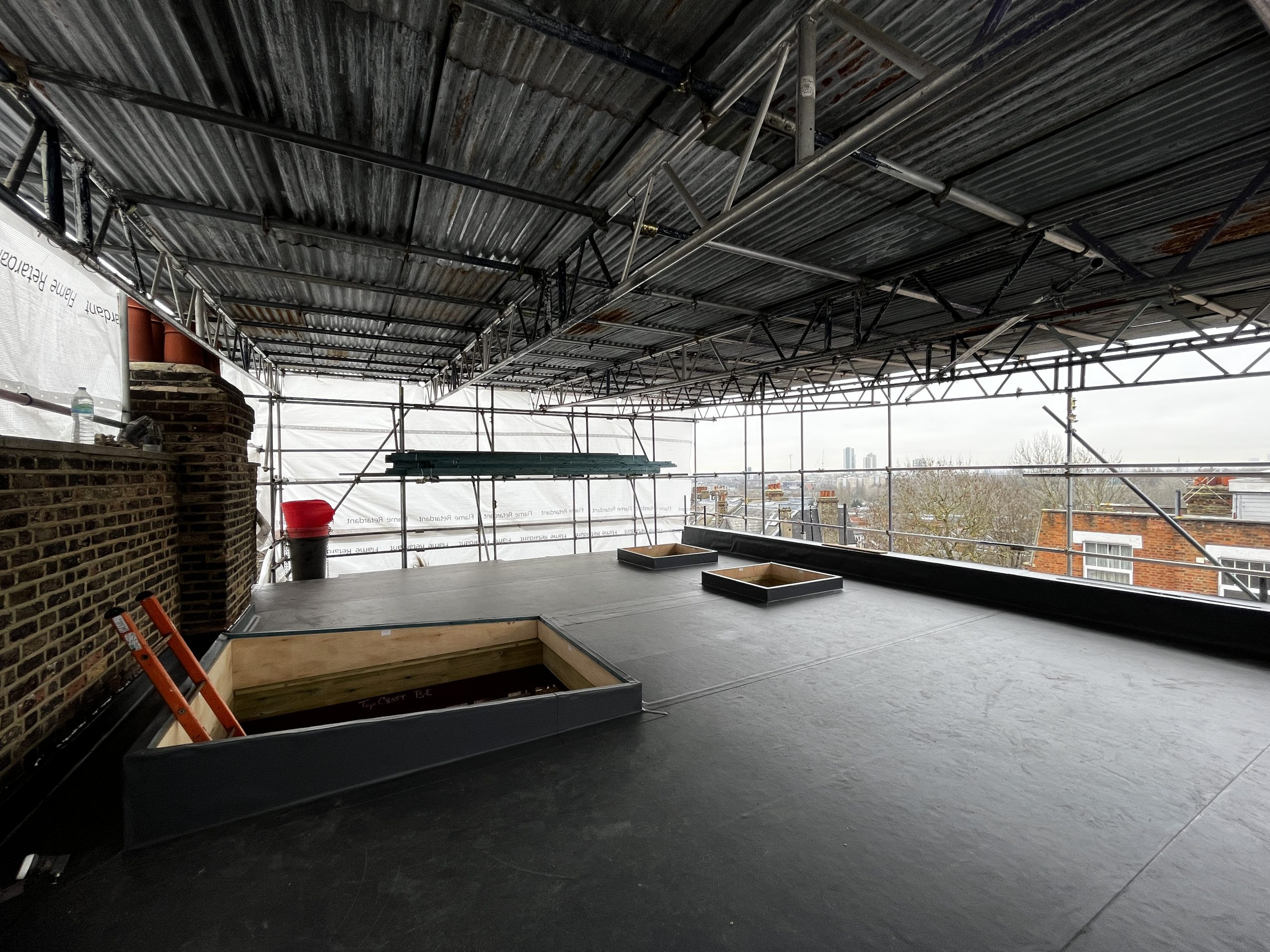 Access to the reconfigured roof terrace is via a new staircase in the kitchen/dining room through an opening glass box rooflight. The roof terrace design incorporates flat rooflights sitting flush with the roof decking in order to create a simple canvas for the clients plants to be arranged around as well as a backdrop to the dramatic views across London.