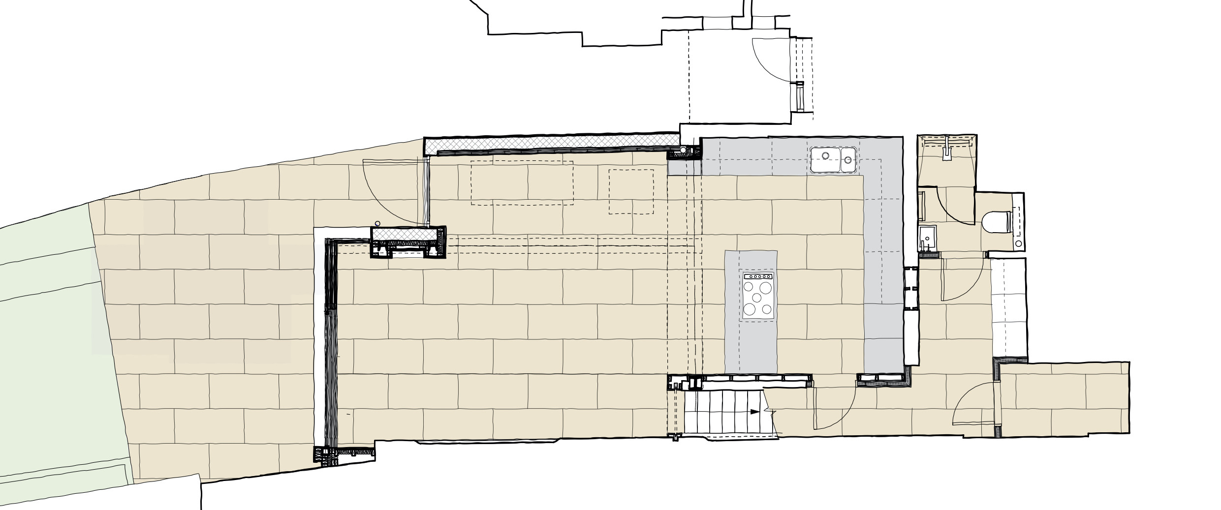 Our extension design in-filled a little used external side passage and extended the accommodation into the garden, with a minimally framed glass screen and triple sliding doors that serve the main part of the basement, and a large pivot door that terminates the side infill-extension.